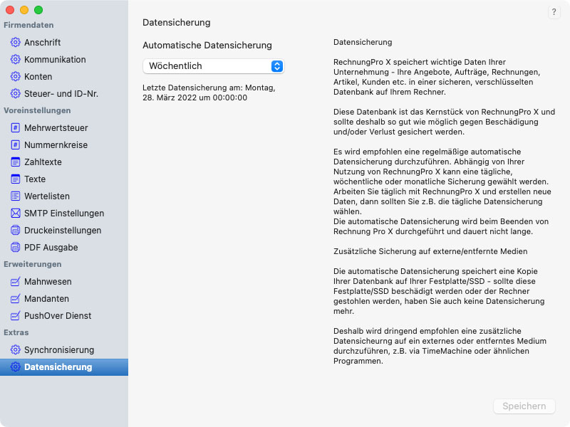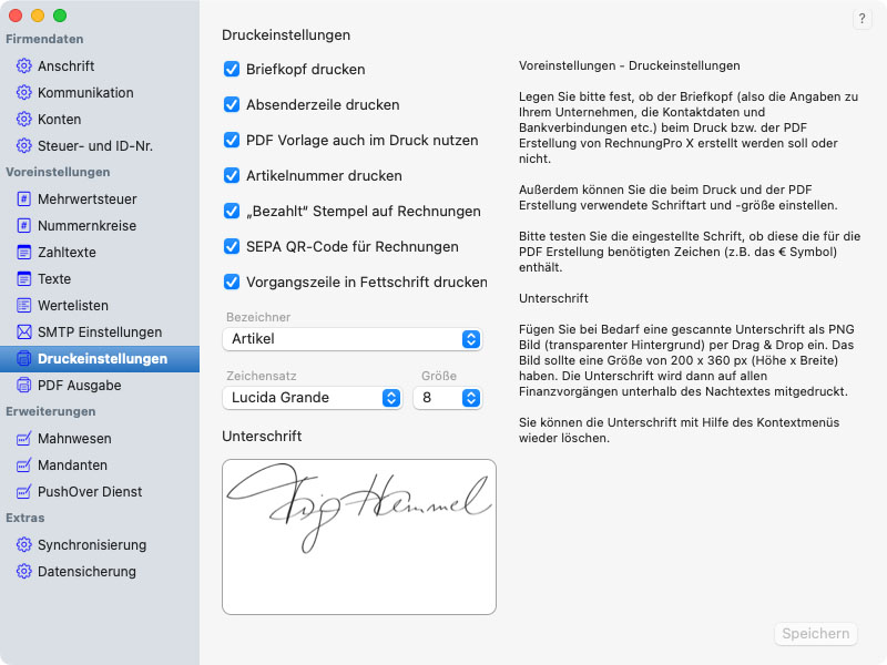 Mit Hilfe der Einstellungen steuern Sie das Verhalten von RechnungPro X, legen Vorgabetexte fest, die dann automatisch in Rechnungen und eMails verwendet werden, fügen Ihr Firmenlogo bzw. Briefpapier ein.