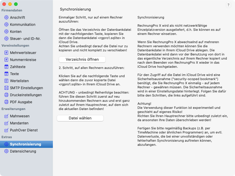 Sie erreichen die Einstellungen durch den Menübefehl Einstellungen aus dem RechnungPro Menü oder mit dem Tastaturkürzel CMD , (Command-Taste und Komma). Beim ersten Programmstart werden Ihnen die Einstellungen automatisch angezeigt.